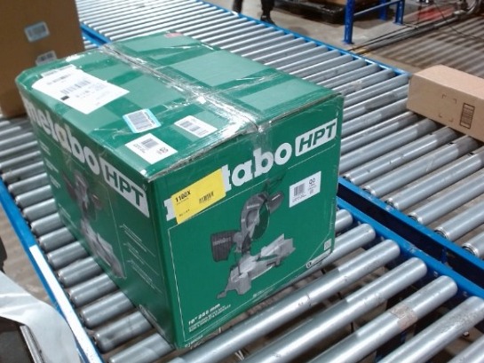 This Metabo HPT C10FCG2 miter saw is a 10-inch compound miter saw. It features a 15-amp motor with a no-load speed of 5,000 RPM. The saw has a positive miter and bevel scale for accurate angle setting. It includes a horizontal handle for improved grip and control. This Metabo HPT Miter Saw is being sold "As-Is".