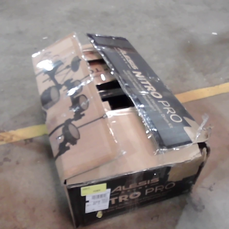 This Alesis Nitro Pro electronic drum kit includes a snare drum, three tom drums, two crash cymbals, one ride cymbal, a hi-hat cymbal, and a bass drum trigger pedal. It features a central drum module for sound control and connectivity.